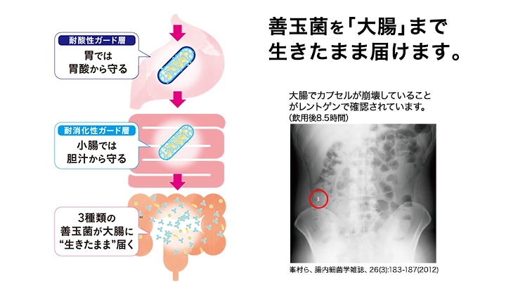 臨床試験において「大腸デリバリーカプセル」を摂取した成人男性の83%で摂取後、カプセルが胃や小腸を通過し、大腸付近で崩壊することが示唆されています。(峯村ら、腸内細菌学雑誌、26(3):183-187(2012))