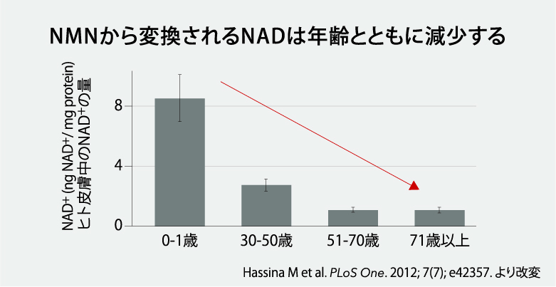 --NMNを摂取するとNAD(ニコチンアミドアデニンジヌクレオチド)に変化しNAD量が増加するということですね。加齢とともに生体内のNAD量は減少しますが、NADがゼロになるということはあるのでしょうか?