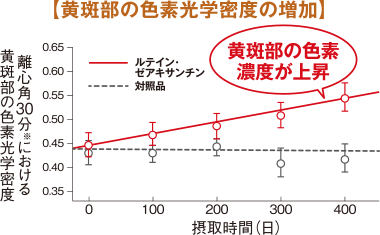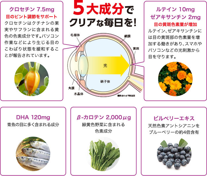 - 本品にはクロセチンとルテイン・ゼアキサンチンが含まれます。クロセチンは目のピント調節をサポートする(パソコン作業などにより生じる目の調節機能の低下を和らげる)ことが報告されています。ルテイン・ゼアキサンチンは黄斑部の色素量を維持し、光刺激によるストレスから目を保護する機能が報告されています。